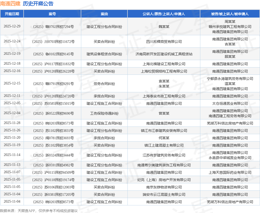 案号:(2025)沪0120民初24720号根据统计,近一年内以南通四建集团有限公司为当事人的历史开庭公告有599则,其中案由为“建设工程施工合同纠纷”的公告以172则居首,其次为“买卖合同纠纷”有124则,“建设工程分包合同纠纷”有59则。历史开庭公告(前20条)如下: