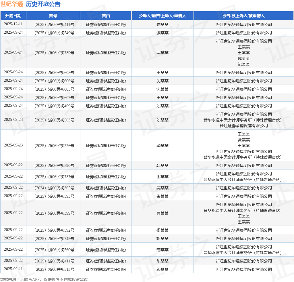 根据统计,近一年内以浙江世纪华通集团股份有限公司为当事人的历史开庭公告有22则,其中案由为“证券虚假陈述责任纠纷”的公告以22则居首。历史开庭公告(前20条)如下: