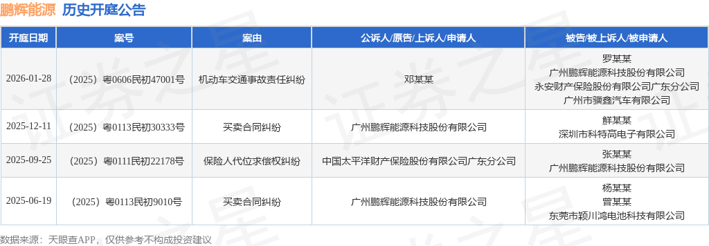 案号:(2025)粤0113民初30333号根据统计,近一年内以广州鹏辉能源科技股份有限公司为当事人的历史开庭公告有4则,其中案由为“买卖合同纠纷”的公告以2则居首,其次为“保险人代位求偿权纠纷”有1则,“机动车交通事故责任纠纷”有1则。历史开庭公告如下: