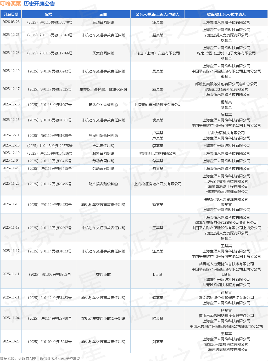 案号:(2025)浙0110民初31639号根据统计,近一年内以上海壹佰米网络科技有限公司为当事人的历史开庭公告有148则,其中案由为“非机动车交通事故责任纠纷”的公告以49则居首,其次为“劳动争议”有37则,“房屋租赁合同纠纷”有12则。历史开庭公告(前20条)如下: