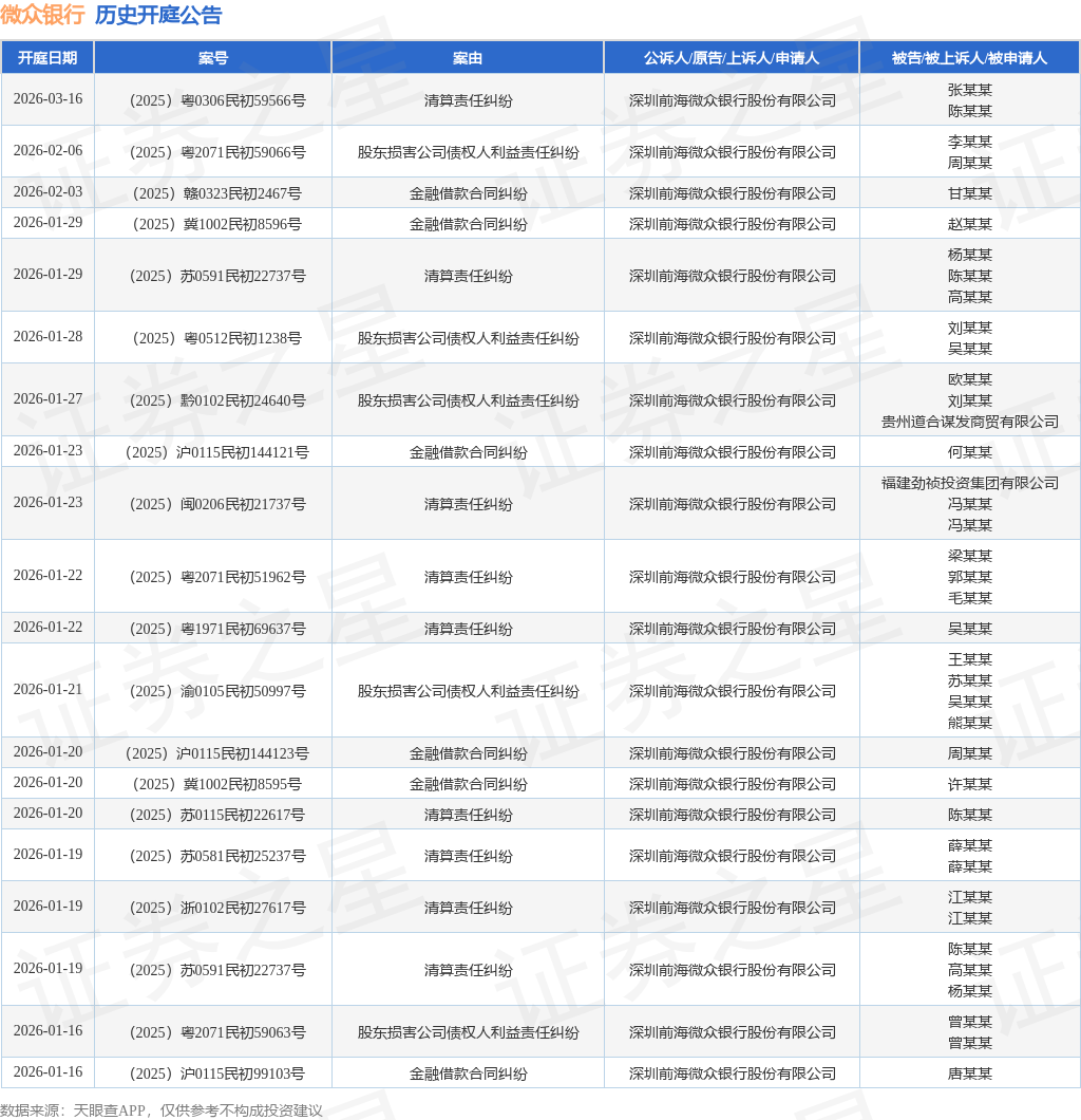 案号:(2025)苏0583民初32248号根据统计,近一年内以深圳前海微众银行股份有限公司为当事人的历史开庭公告有1845则,其中案由为“金融借款合同纠纷”的公告以1294则居首,其次为“清算责任纠纷”有155则,“股东损害公司债权人利益责任纠纷”有127则。历史开庭公告(前20条)如下:
