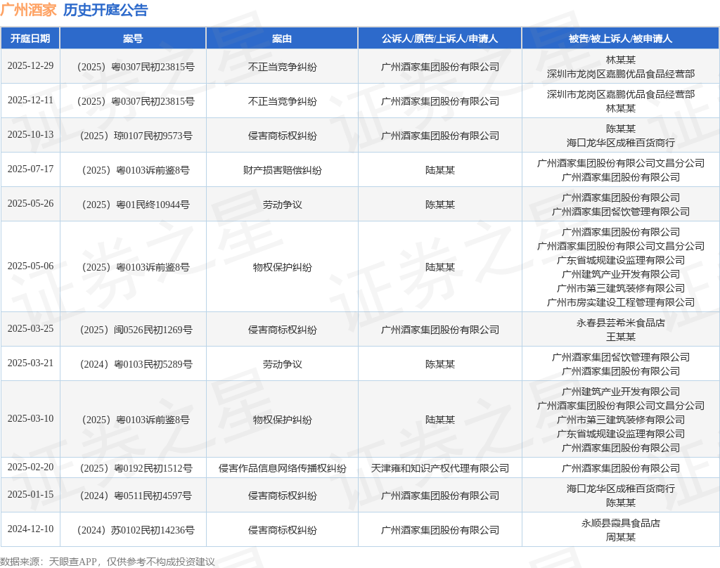 案号:(2025)粤0307民初23815号根据统计,近一年内以广州酒家集团股份有限公司为当事人的历史开庭公告有12则,其中案由为“侵害商标权纠纷”的公告以4则居首,其次为“不正当竞争纠纷”有2则,“劳动争议”有2则。历史开庭公告如下: