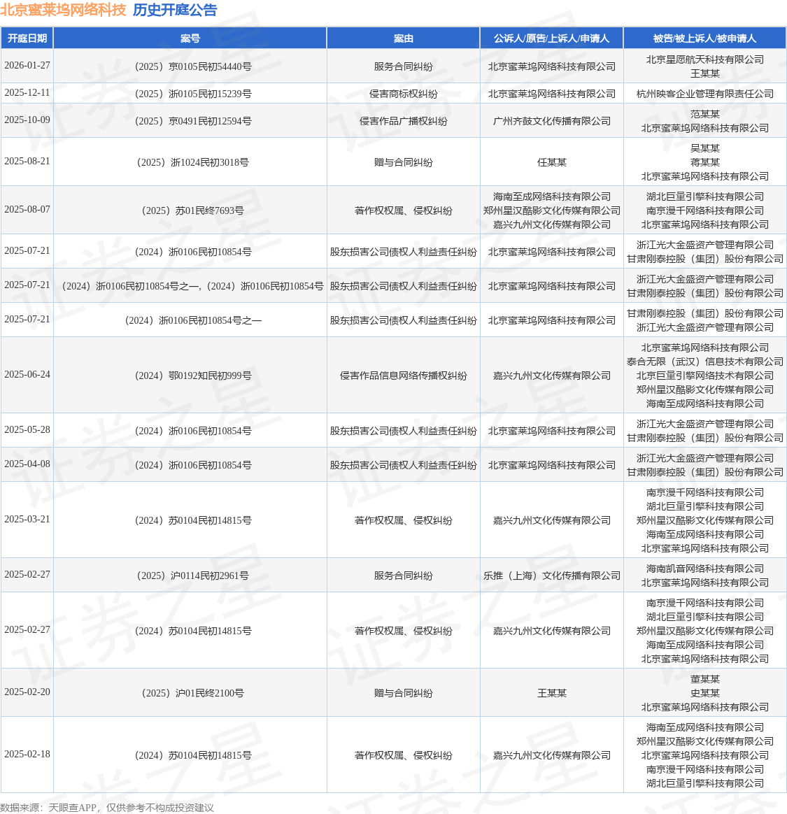 案号:(2025)浙0105民初15239号根据统计,近一年内以北京蜜莱坞网络科技有限公司为当事人的历史开庭公告有16则,其中案由为“股东损害公司债权人利益责任纠纷”的公告以5则居首,其次为“著作权权属、侵权纠纷”有4则,“服务合同纠纷”有2则。历史开庭公告如下: