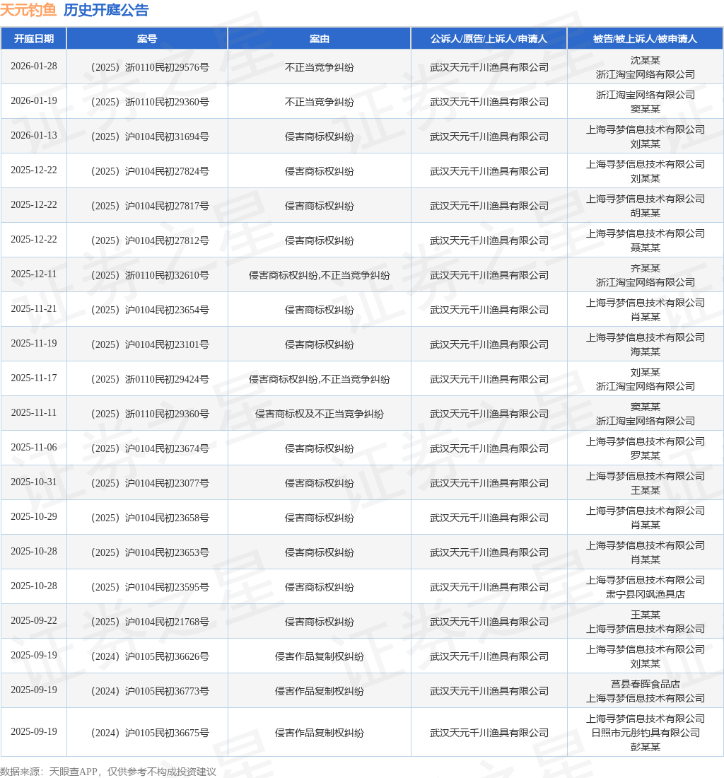 案号:(2025)浙0110民初32610号根据统计,近一年内以武汉天元千川渔具有限公司为当事人的历史开庭公告有92则,其中案由为“侵害商标权纠纷”的公告以57则居首,其次为“侵害作品复制权纠纷”有19则,“侵害作品发行权纠纷”有6则。历史开庭公告(前20条)如下: