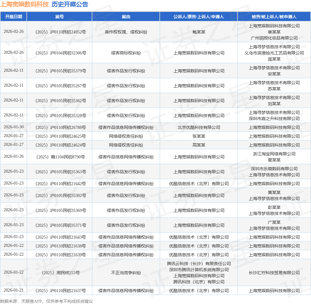 案号:(2025)沪0110民初24827号根据统计,近一年内以上海宽娱数码科技有限公司为当事人的历史开庭公告有742则,其中案由为“侵害作品信息网络传播权纠纷”的公告以388则居首,其次为“著作权权属、侵权纠纷”有147则,“网络侵权责任纠纷”有57则。历史开庭公告(前20条)如下: