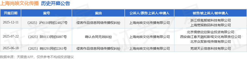 证券之星消息,根据天眼查APP显示,近日公布了一则上海尚映文化传播有限公司作为原告/上诉人的开庭公告,详细内容如下: