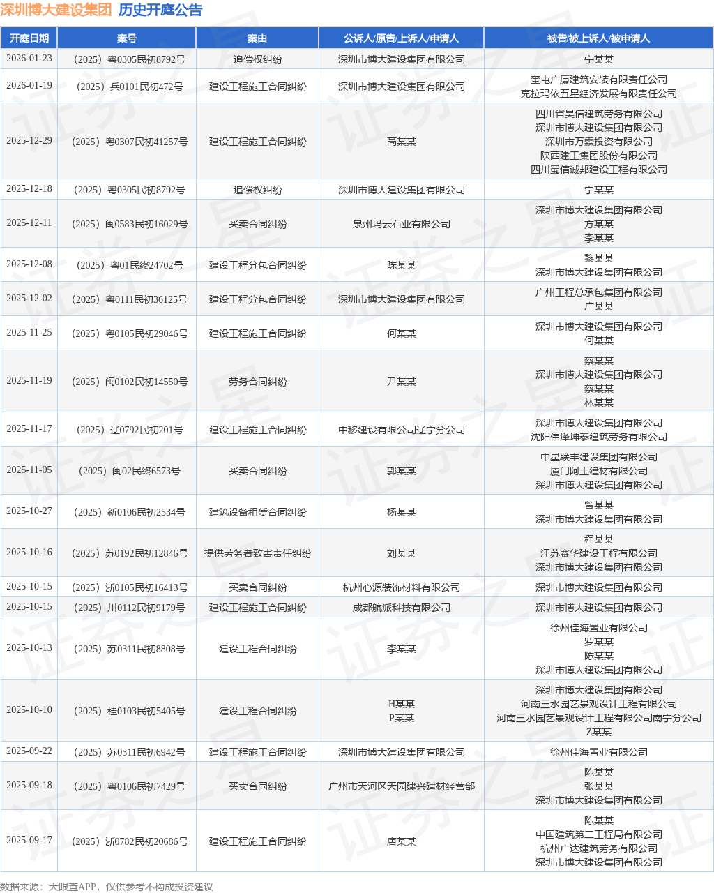 案号:(2025)闽0583民初16029号根据统计,近一年内以深圳市博大建设集团有限公司为当事人的历史开庭公告有189则,其中案由为“劳务合同纠纷”的公告以57则居首,其次为“买卖合同纠纷”有29则,“建设工程施工合同纠纷”有24则。历史开庭公告(前20条)如下: