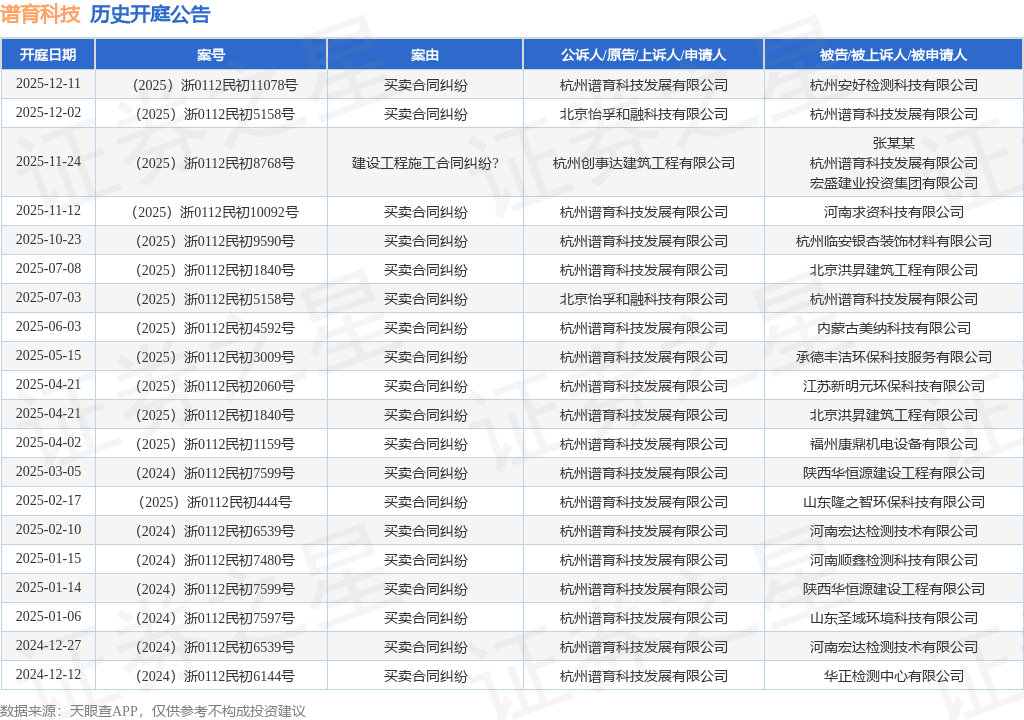 根据统计,近一年内以杭州谱育科技发展有限公司为当事人的历史开庭公告有20则,其中案由为“买卖合同纠纷”的公告以19则居首,其次为“建设工程施工合同纠纷?”有1则。历史开庭公告如下: