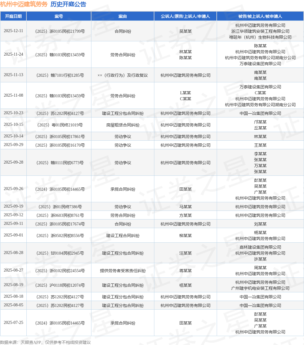 案号:(2025)浙0105民初21799号根据统计,近一年内以杭州中迈建筑劳务有限公司为当事人的历史开庭公告有48则,其中案由为“建设工程分包合同纠纷”的公告以12则居首,其次为“劳动争议”有8则,“劳务合同纠纷”有6则。历史开庭公告(前20条)如下: