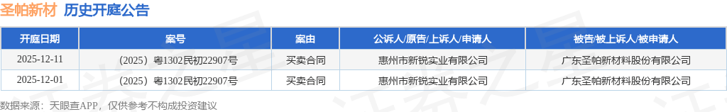 根据统计,近一年内以广东圣帕新材料股份有限公司为当事人的历史开庭公告有2则,其中案由为“买卖合同”的公告以2则居首。历史开庭公告如下: