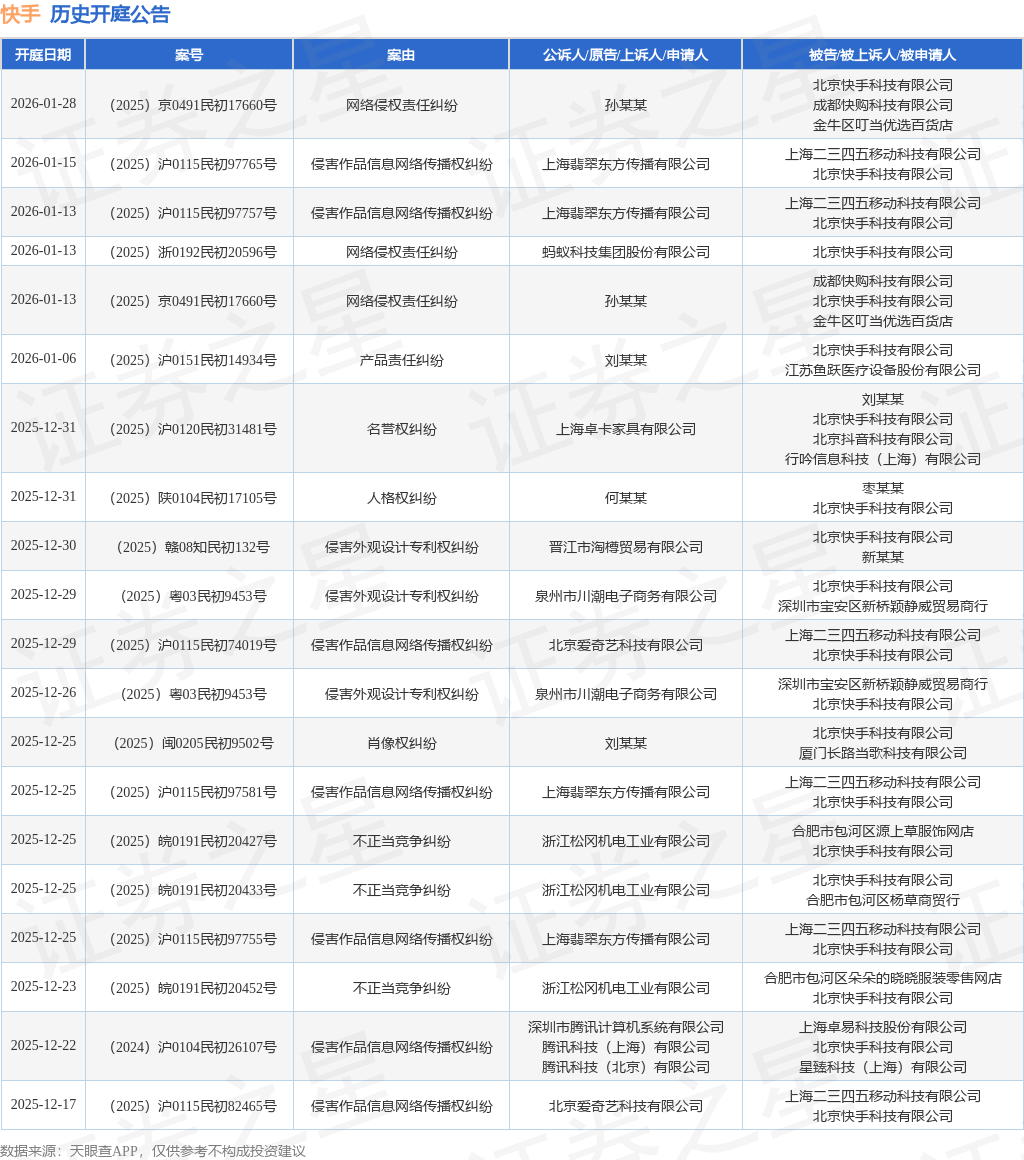 案号:(2024)浙01民初2790号根据统计,近一年内以北京快手科技有限公司为当事人的历史开庭公告有367则,其中案由为“侵害作品信息网络传播权纠纷”的公告以86则居首,其次为“侵害商标权纠纷”有39则,“著作权权属、侵权纠纷”有33则。历史开庭公告(前20条)如下: