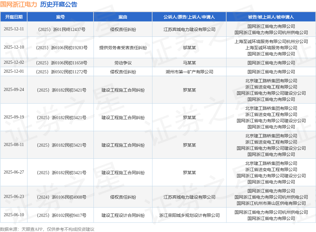 案号:(2025)浙01民终12437号根据统计,近一年内以国网浙江省电力有限公司为当事人的历史开庭公告有10则,其中案由为“建设工程施工合同纠纷”的公告以4则居首,其次为“侵权责任纠纷”有3则,“劳动争议”有1则。历史开庭公告如下: