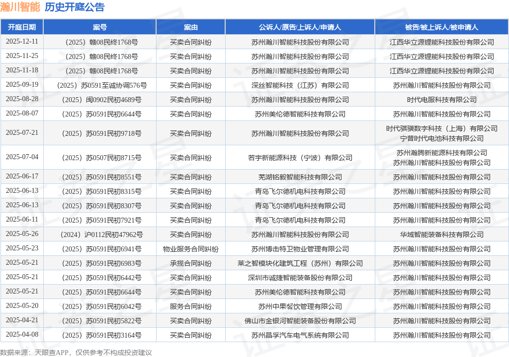 案号:(2025)赣08民终1768号根据统计,近一年内以苏州瀚川智能科技股份有限公司为当事人的历史开庭公告有39则,其中案由为“买卖合同纠纷”的公告以30则居首,其次为“承揽合同纠纷”有4则,“定作合同纠纷”有2则。历史开庭公告(前20条)如下: