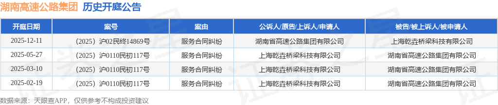 根据统计,近一年内以湖南省高速公路集团有限公司为当事人的历史开庭公告有4则,其中案由为“服务合同纠纷”的公告以4则居首。历史开庭公告如下: