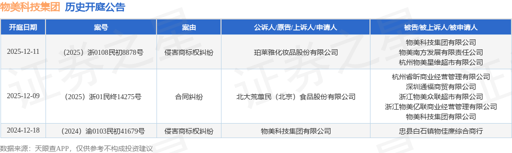 根据统计,近一年内以物美科技集团有限公司为当事人的历史开庭公告有3则,其中案由为“侵害商标权纠纷”的公告以2则居首,其次为“合同纠纷”有1则。历史开庭公告如下: