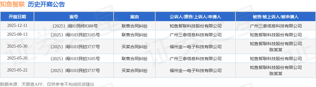 根据统计,近一年内以知鱼智联科技股份有限公司为当事人的历史开庭公告有5则,其中案由为“联营合同纠纷”的公告以3则居首,其次为“买卖合同纠纷”有2则。历史开庭公告如下: