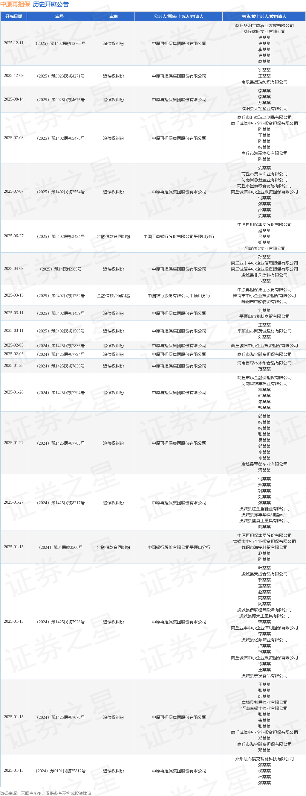 案号:(2025)豫1402民初12765号根据统计,近一年内以中原再担保集团股份有限公司为当事人的历史开庭公告有40则,其中案由为“追偿权纠纷”的公告以34则居首,其次为“金融借款合同纠纷”有5则,“追偿权”有1则。历史开庭公告(前20条)如下:
