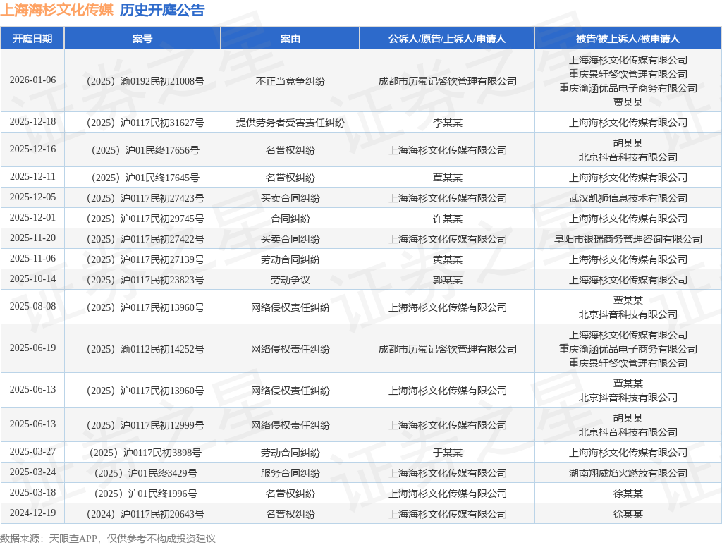 案号:(2025)沪01民终17645号根据统计,近一年内以上海海杉文化传媒有限公司为当事人的历史开庭公告有17则,其中案由为“名誉权纠纷”的公告以4则居首,其次为“网络侵权责任纠纷”有4则,“买卖合同纠纷”有2则。历史开庭公告如下: