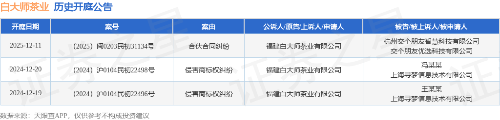 根据统计,近一年内以福建白大师茶业有限公司为当事人的历史开庭公告有3则,其中案由为“侵害商标权纠纷”的公告以2则居首,其次为“合伙合同纠纷”有1则。历史开庭公告如下: