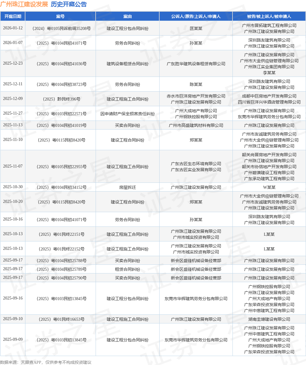 案号:(2025)粤0104民初38723号根据统计,近一年内以广州珠江建设发展有限公司为当事人的历史开庭公告有157则,其中案由为“买卖合同纠纷”的公告以58则居首,其次为“建设工程分包合同纠纷”有15则,“建设工程施工合同纠纷”有13则。历史开庭公告(前20条)如下: