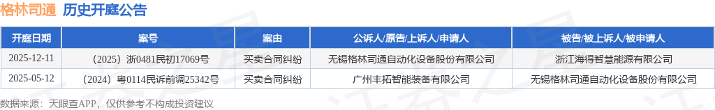 证券之星消息,根据天眼查APP显示,近日公布了一则无锡格林司通自动化设备股份有限公司作为原告/上诉人的开庭公告,详细内容如下:
