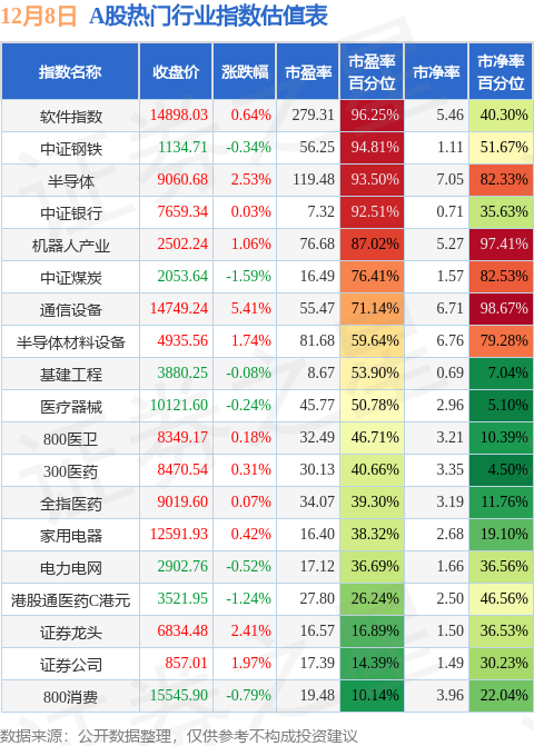 热门行业指数方面,软件指数的市盈率百分位较高,为96.25%。而800消费的市盈率百分位较低,为10.14%。