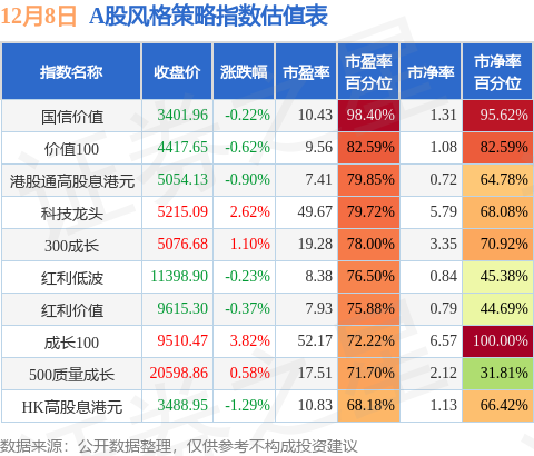 风格策略指数方面,国信价值的市盈率百分位较高,为98.4%。而HK高股息港元的市盈率百分位较低,为68.18%。