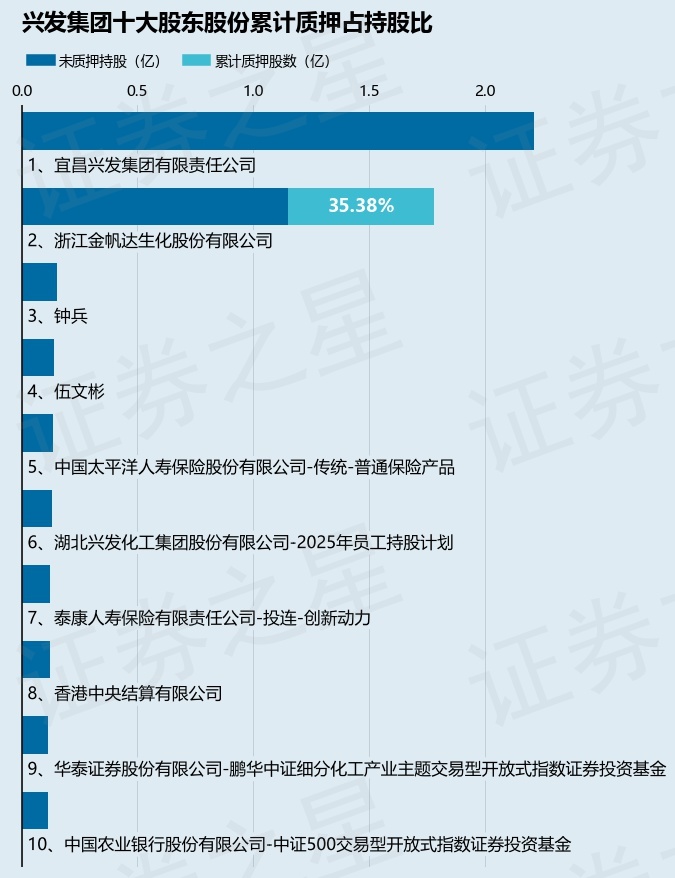 截止本公告日,股东浙江金帆达生化股份有限公司已累计质押股份6300.0万股,占其持股总数的35.38%。本次质押后兴发集团十大股东的累计质押股份占持股比例(占持股比例的计算以公司最新一期财务报表公布的十大股东的持股总数为基准)见下图: