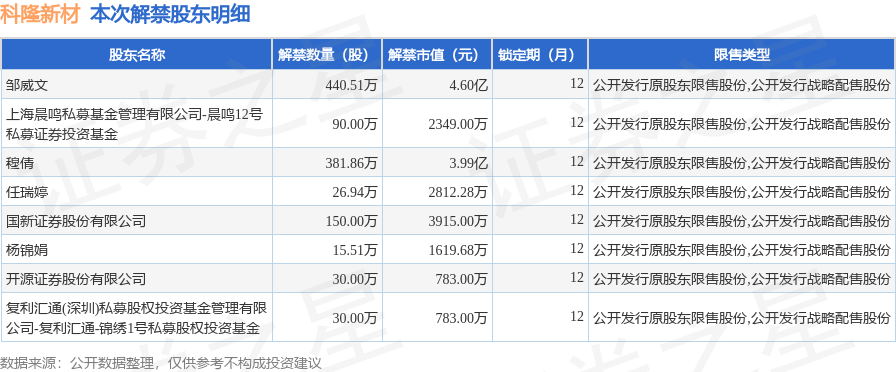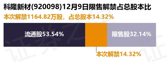 证券之星消息,根据市场公开信息整理,科隆新材(920098)于12月9日将有1164.82万股限售股份解禁,为公司公开发行原股东限售股份,公开发行战略配售股份,占公司总股本14.32%。(本次数据根据历史公告整理得出,实际情况以上市公司最新公告为准)最近一年内,该股累计解禁2922.6万股,占总股本的35.94%。本次解禁后,公司还有2613.44万股限售股份,占总股本32.14%。具体如下图所示: