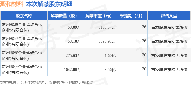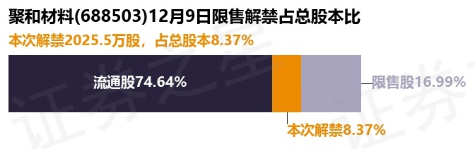 证券之星消息,根据市场公开信息整理,聚和材料(688503)于12月9日将有2025.5万股限售股份解禁,为公司首发原股东限售股份,占公司总股本8.37%。(本次数据根据历史公告整理得出,实际情况以上市公司最新公告为准)最近一年内,该股累计解禁183.99万股,占总股本的0.76%。本次解禁后,公司还有4111.38万股限售股份,占总股本16.99%。具体如下图所示: