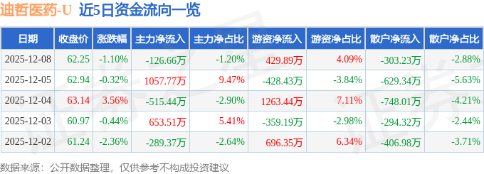 证券之星消息,截至2025年12月8日收盘,迪哲医药(688192)报收于62.25元,下跌1.1%,换手率0.37%,成交量1.69万手,成交额1.05亿元。
