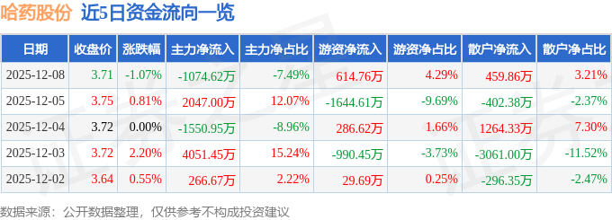 证券之星消息,截至2025年12月8日收盘,哈药股份(600664)报收于3.71元,下跌1.07%,换手率1.53%,成交量38.56万手,成交额1.43亿元。
