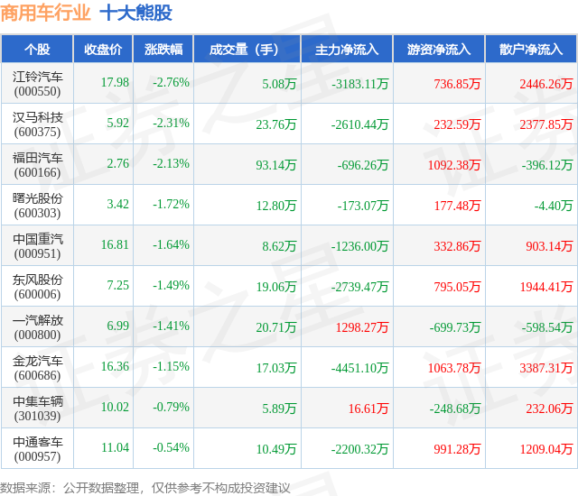 个股表现方面,商用车行业当日领跌股为江铃汽车(000550),该股当日报收17.98,下跌2.76%,成交量5.08万,主力资金净流出3183.11万元。汉马科技(600375)以下跌2.31%紧随其后,该股当日成交量23.76万,主力资金净流出2610.44万元。除此之外,福田汽车(600166)、曙光股份(600303)、中国重汽(000951)均进入当日熊股之列。具体个股列表见下表: