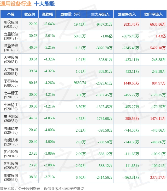 个股表现方面,通用设备行业当日领跌股为川仪股份(603100),该股当日报收22.09,下跌5.64%,成交量19.43万,主力资金净流出9467.31万元。力星股份(300421)以下跌5.61%紧随其后,该股当日成交量59.65万,主力资金净流出1.06亿元。除此之外,博盈特焊(301468)、天罡股份(920651)、天罡股份(920651)均进入当日熊股之列。具体个股列表见下表: