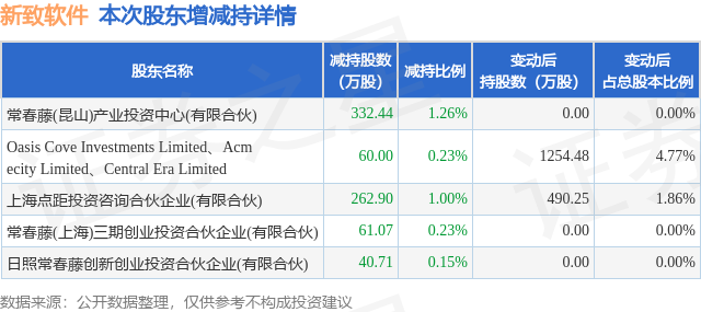 证券之星消息,12月9日新致软件发布公告《新致软件:股东减持股份结果公告》,其股东常春藤(昆山)产业投资中心(有限合伙)、Oasis Cove Investments Limited、Acmecity Limited、Central Era Limited、上海点距投资咨询合伙企业(有限合伙)、常春藤(上海)三期创业投资合伙企业(有限合伙)、日照常春藤创新创业投资合伙企业(有限合伙)于2025年9月10日至2025年12月9日间合计减持757.12万股,占公司目前总股本的2.8799%,变动期间该股股价下跌15.19%,截止12月9日收盘报18.15元。