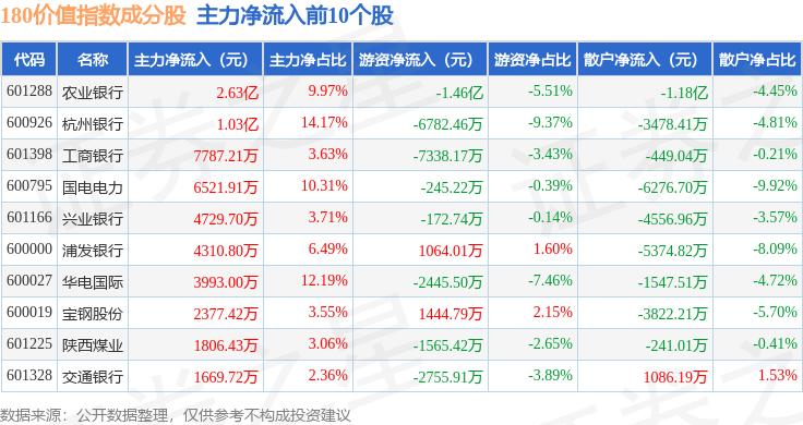 资金流向方面,180价值(000029)指数成份股当日主力资金净流出合计37.35亿元,游资资金净流入合计14.62亿元,散户资金净流入合计22.73亿元。成份股资金流向详情见下表: