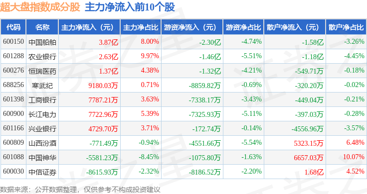 资金流向方面,超大盘(000043)指数成份股当日主力资金净流出合计31.41亿元,游资资金净流入合计16.63亿元,散户资金净流入合计14.79亿元。成份股资金流向详情见下表: