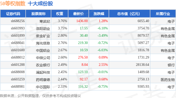 50等权(000050)指数十大成份股详情如下: