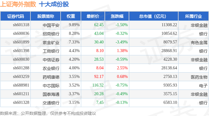 证券之星消息,12月9日,上证海外(000054)指数报收于1571.26点,跌1.05%,成交769.65亿元,换手率0.31%。当日该指数成份股中,上涨的有11家,农业银行以2.55%的涨幅领涨,下跌的有52家,中国中冶以10.03%的跌幅领跌。