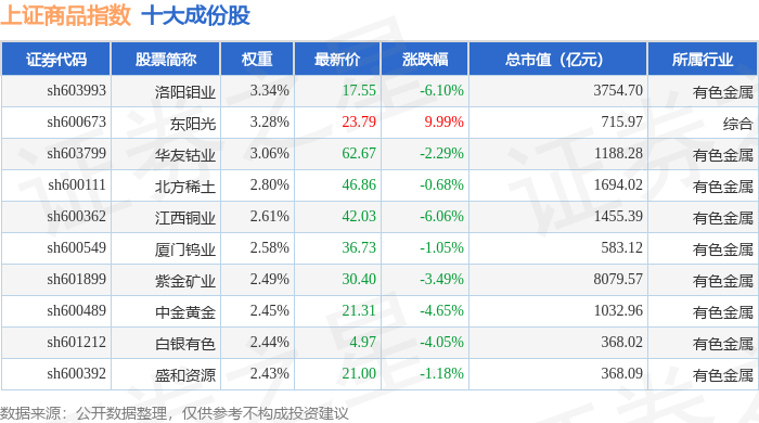 证券之星消息,12月9日,上证商品(000066)指数报收于3348.29点,跌1.73%,成交528.44亿元,换手率0.66%。当日该指数成份股中,上涨的有5家,东阳光以9.99%的涨幅领涨,下跌的有44家,洛阳钼业以6.1%的跌幅领跌。