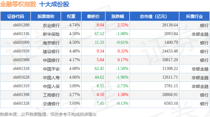 证券之星消息,12月9日,金融等权(000076)指数报收于5664.58点,跌0.53%,成交337.59亿元,换手率0.22%。当日该指数成份股中,上涨的有6家,农业银行以2.55%的涨幅领涨,下跌的有23家,中国人保以2.73%的跌幅领跌。