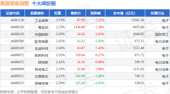 证券之星消息,12月9日,高端装备(000097)指数报收于11129.91点,涨0.31%,成交1296.37亿元,换手率1.49%。当日该指数成份股中,上涨的有24家,生益科技以7.43%的涨幅领涨,下跌的有35家,汇顶科技以2.61%的跌幅领跌。