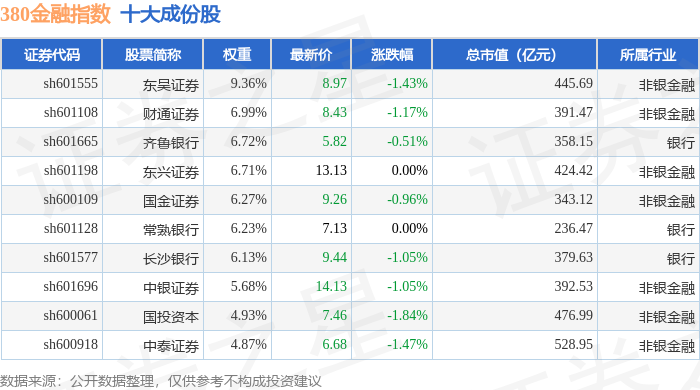证券之星消息,12月9日,380金融(000110)指数报收于4216.23点,跌1.04%,成交61.44亿元,换手率0.9%。当日该指数成份股中,上涨的有1家,厦门银行以1.21%的涨幅领涨,下跌的有17家,浙江东方以2.83%的跌幅领跌。
