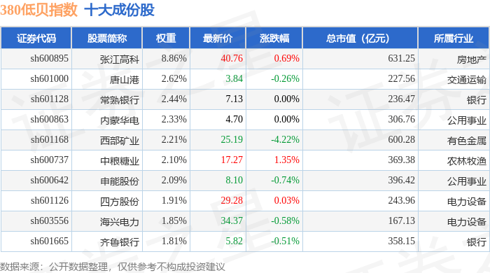 证券之星消息,12月9日,380低贝(000138)指数报收于8108.4点,跌0.6%,成交224.61亿元,换手率0.91%。当日该指数成份股中,上涨的有19家,海油发展以2.61%的涨幅领涨,下跌的有76家,和邦生物以5.08%的跌幅领跌。