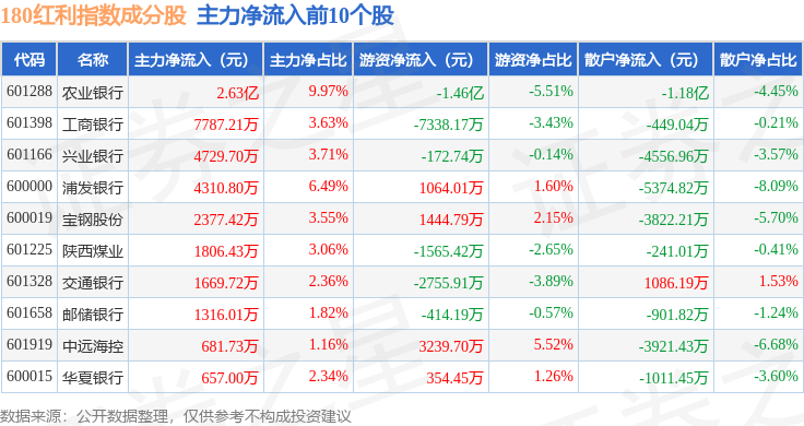 资金流向方面,180红利(000149)指数成份股当日主力资金净流出合计7.26亿元,游资资金净流入合计2.55亿元,散户资金净流入合计4.71亿元。成份股资金流向详情见下表: