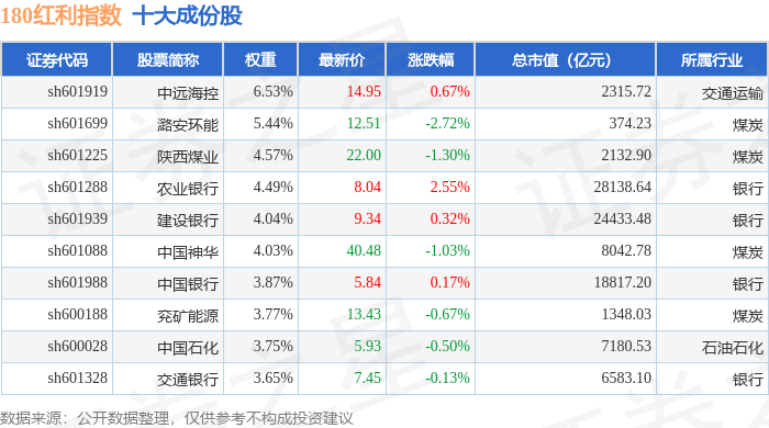 证券之星消息,12月9日,180红利(000149)指数报收于4013.88点,跌0.54%,成交287.38亿元,换手率0.2%。当日该指数成份股中,上涨的有7家,农业银行以2.55%的涨幅领涨,下跌的有23家,中国建筑以2.84%的跌幅领跌。