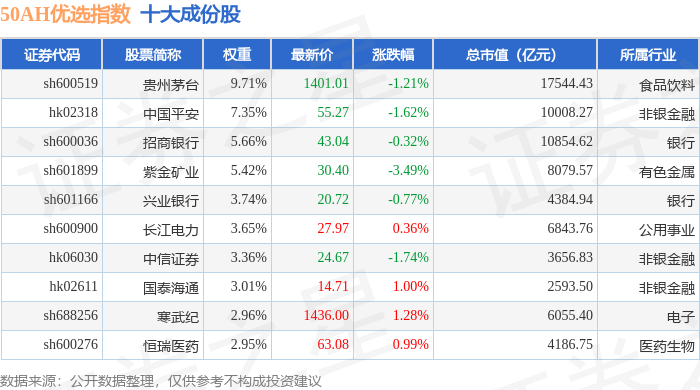 证券之星消息,12月9日,50AH优选(000170)指数报收于6156.05点,跌1.14%,成交857.39亿元,换手率0.41%。当日该指数成份股中,上涨的有11家,中国船舶以2.43%的涨幅领涨,下跌的有39家,洛阳钼业以6.42%的跌幅领跌。