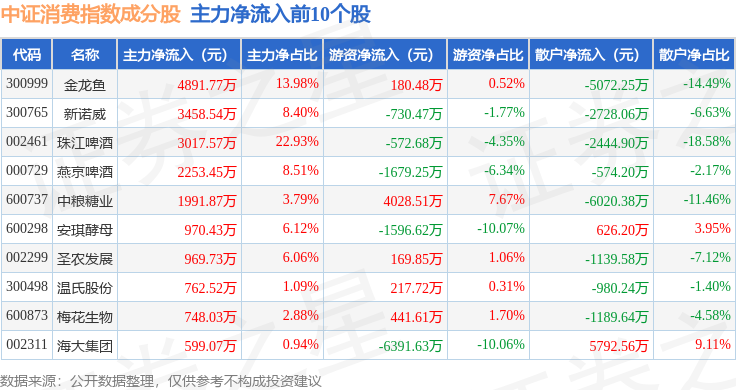 资金流向方面,中证消费(000932)指数成份股当日主力资金净流出合计23.83亿元,游资资金净流入合计14.21亿元,散户资金净流入合计9.62亿元。成份股资金流向详情见下表: