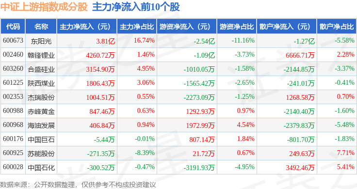 资金流向方面,中证上游(000961)指数成份股当日主力资金净流出合计58.08亿元,游资资金净流入合计18.57亿元,散户资金净流入合计39.5亿元。成份股资金流向详情见下表: