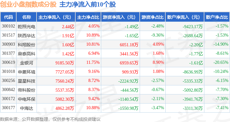 资金流向方面,创业小盘(399020)指数成份股当日主力资金净流出合计23.66亿元,游资资金净流入合计7363.98万元,散户资金净流入合计22.92亿元。成份股资金流向详情见下表: